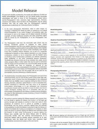 Разрешается документ заполнять на компьютере или от руки, но в обоих случаях подписи проставляются лично каждым участником, цифровые считаются не действительными. Проставление даты и личной росписи модели совершается при наличии третьего свидетеля, если это оговорено в требованиях стока. Другие модели не могут выполнять роль свидетелей. Всем лицам, проставляющим подписи в документе, должны быть больше 18 лет.