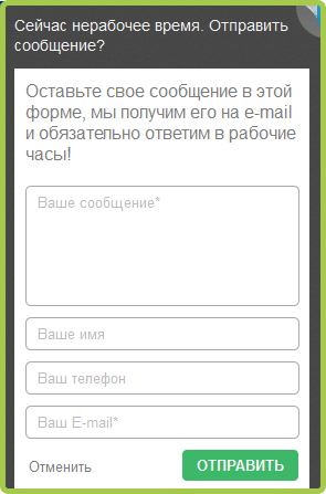 Если обслуживание клиентов не ведётся круглосуточно, при большой разнице во времени между часовыми поясами, пользователям делается предложение оставить в чате сообщение, ответ на которое они получат на свой электронный адрес или по телефону.